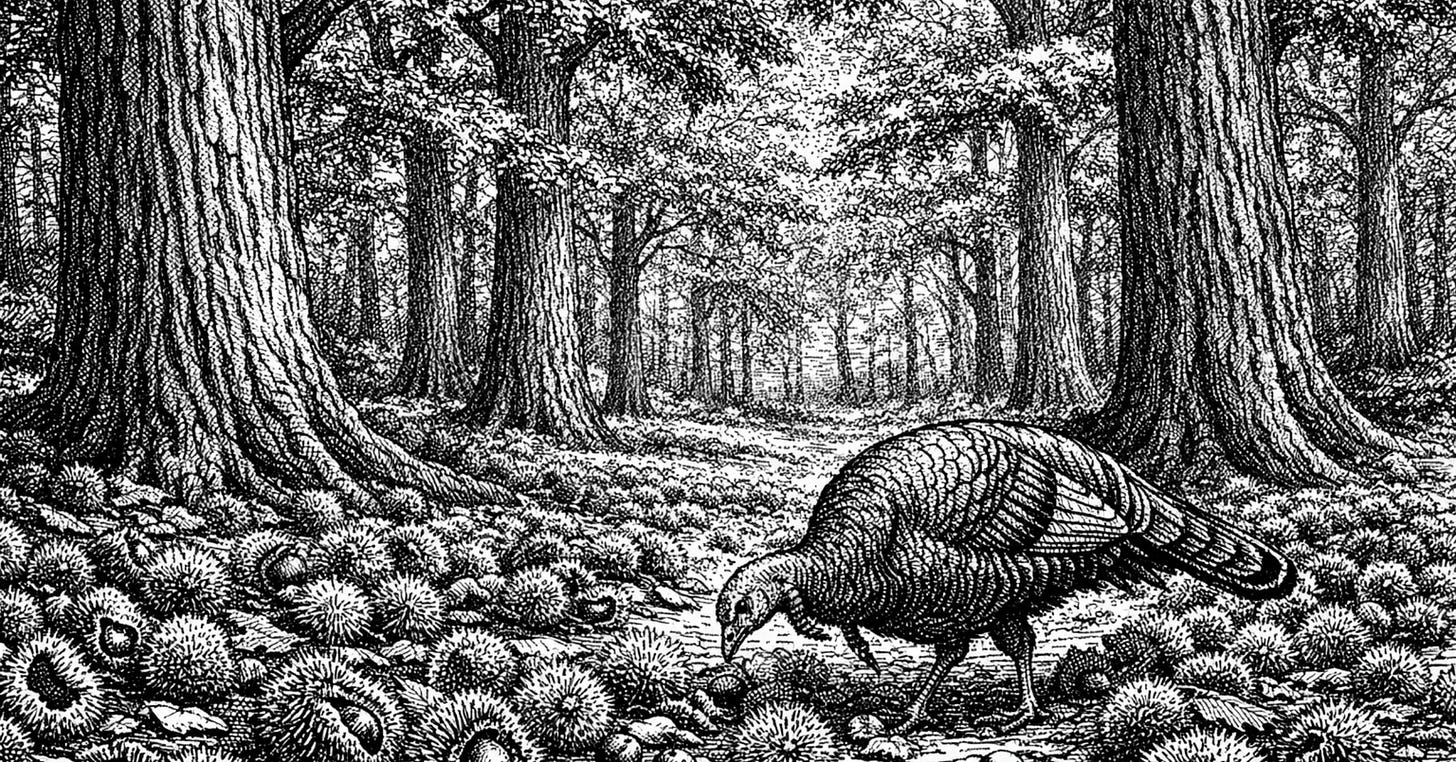 American chestnut was the keystone. One in every four hardwood trees in the eastern forest was a chestnut — immense, straight-trunked trees that could grow a hundred feet tall and ten feet in diameter. No other species produced food so reliably. The nuts fell in such quantities every autumn that they carpeted the forest floor, feeding deer, bear, turkey, squirrels, and the Lenape who gathered them as a staple. The wood was rot-resistant, light, and easy to split — ideal for fencing, building, and fuel. The chestnut was the tree around which the forest was organized.