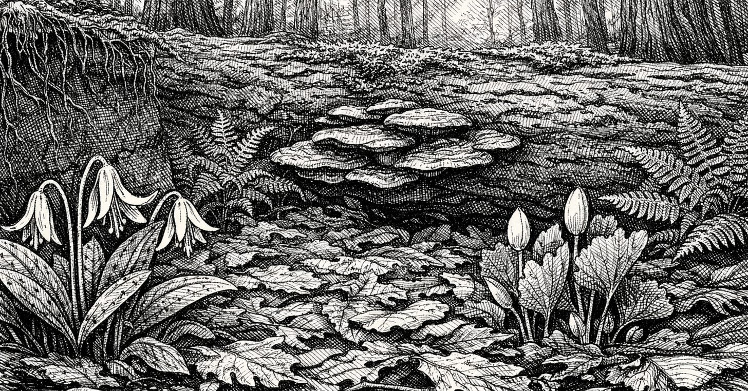 Beneath the overstory canopy, a secondary layer of smaller trees — dogwood, ironwood, sassafras, serviceberry — filled the middle space, producing fruit and flowers at heights that songbirds and pollinators could reach. Below that, a shrub layer of spicebush, witch hazel, and native viburnums created dense cover for ground-nesting birds and small mammals. The herbaceous layer — ferns, wildflowers, native grasses — covered the forest floor in a carpet that shifted with the seasons: trout lily and bloodroot in early spring before the canopy leafed out, then shade-tolerant species through summer. And beneath all of it, the forest floor itself: inches of accumulated leaf litter, decaying wood, fungal networks threading through the soil, cycling nutrients back into the roots of the trees overhead.